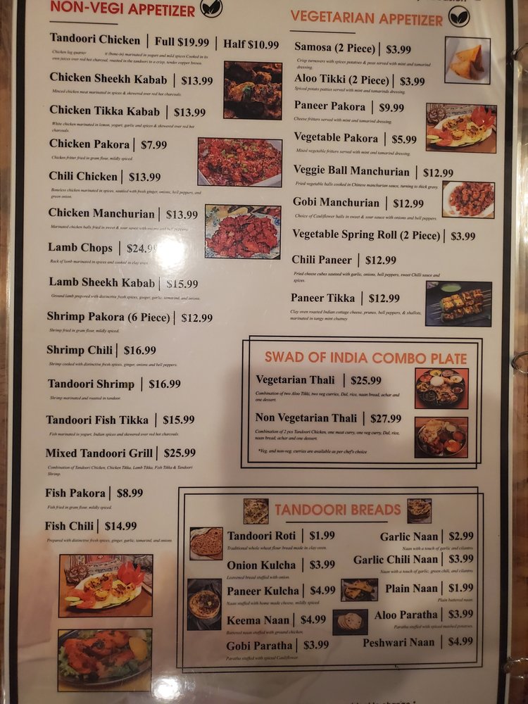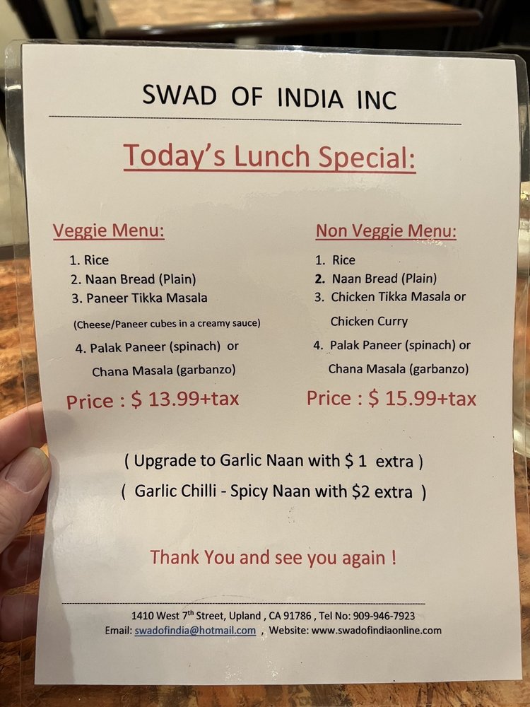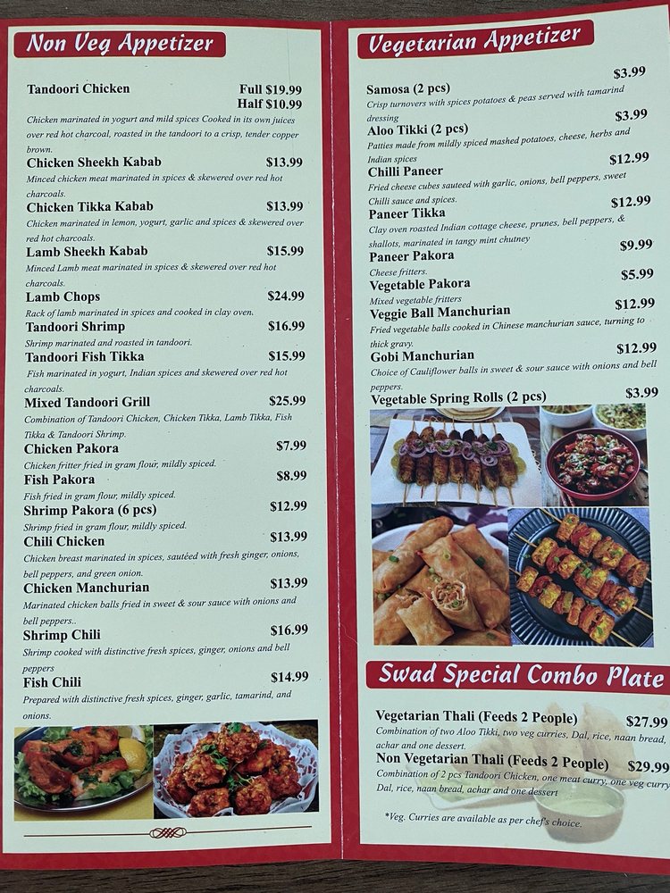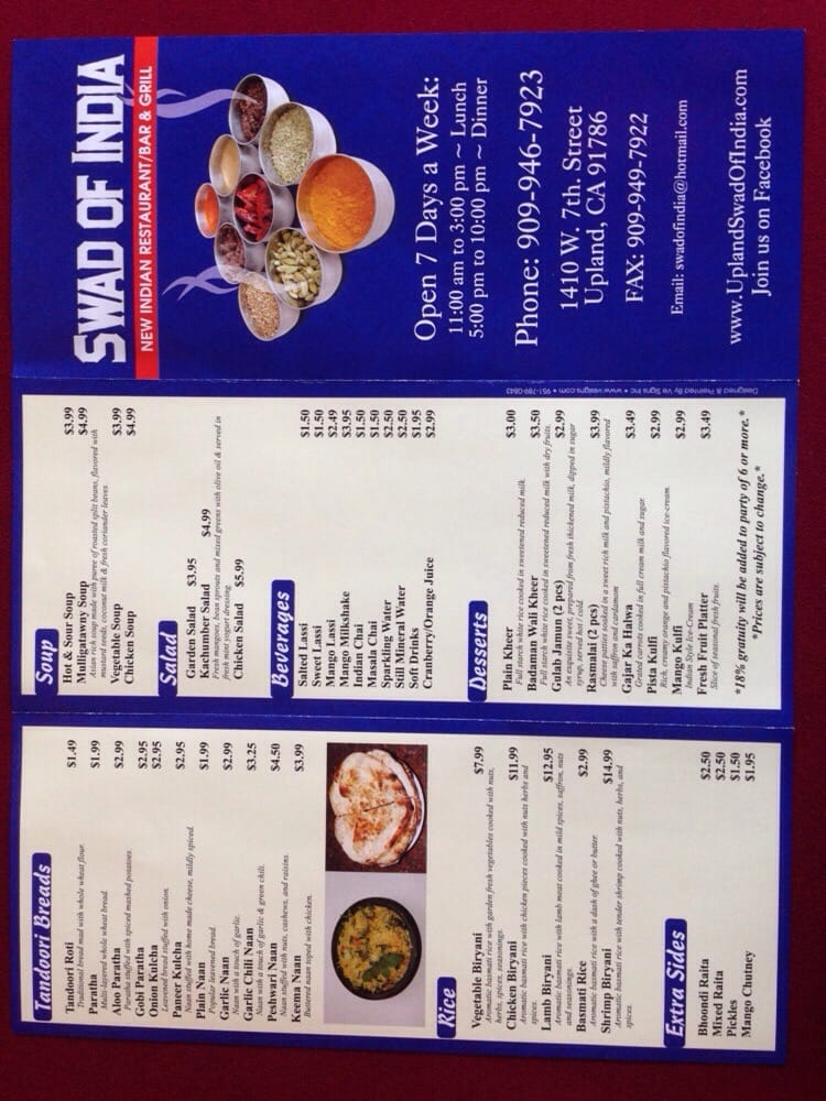 Welcome to Swad of India, a delightful Indian restaurant located in Upland, CA. This casual dining spot offers a variety of vegan and vegetarian options, making it a great choice for groups, families, and even kids. The menu features classic Indian dishes such as Paneer Tikka, Chicken Tikka Kabob, and Lamb Curry, all bursting with authentic flavors. Customers rave about the delicious food and friendly customer service, with popular favorites including Samosas, Garlic Naan, and the refreshing Mango Lassi. Their extensive beverage menu includes traditional Indian drinks like Chai Tea and Jal Jeera. Whether you're looking for a quick takeout meal or a leisurely dinner with friends, Swad of India is sure to impress with its flavorful dishes and welcoming atmosphere.